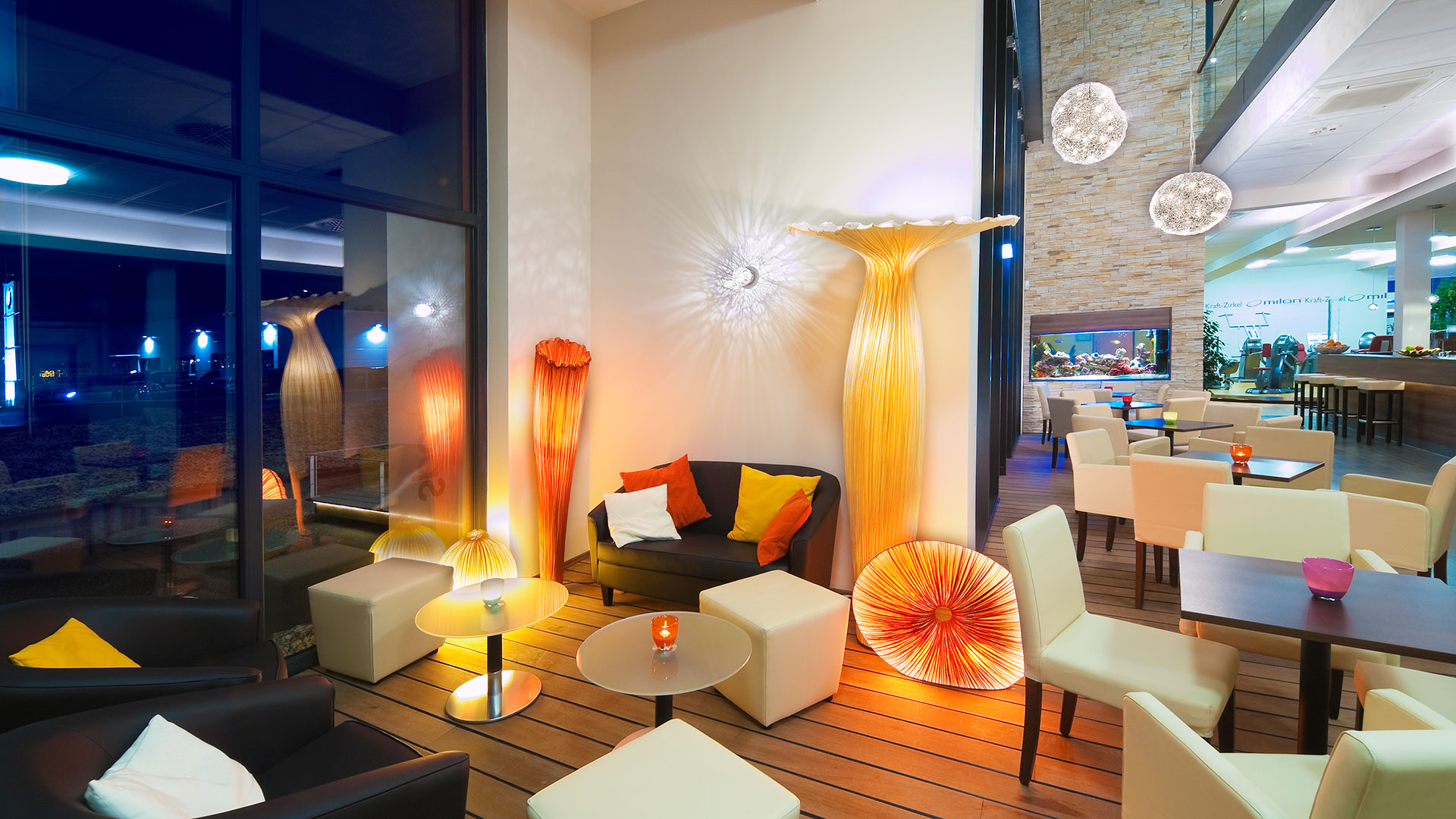 Erstellung eines kompletten Lichtkonzeptes: Wegebeleuchtung, Gebäudebeleuchtung; Funktionale Grundbeleuchtung in den Fitnessräumen einladende Lichtstimmung im Eingangsbereich und im Café, Beleuchtung im Wellnessbereich und auf dem Sonnendeck.