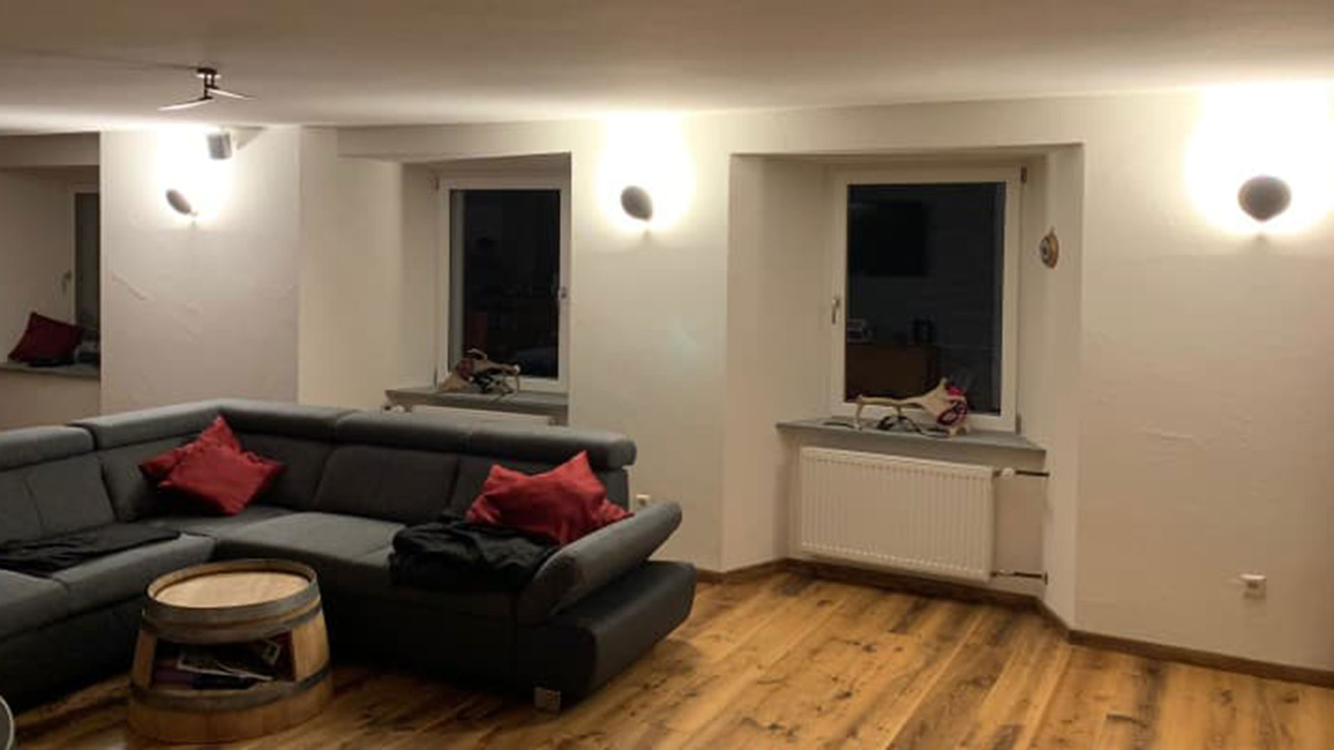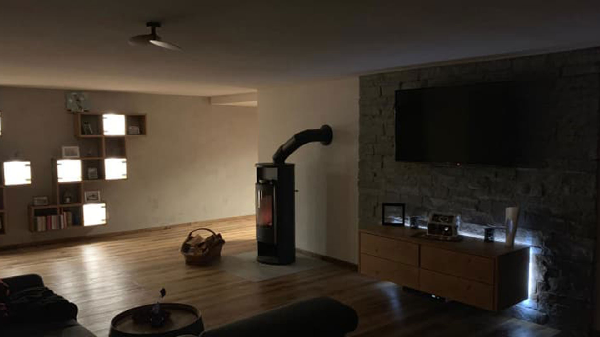 Bei diesem Auftrag handelt es sich um ein Wohngebäude, in dem eine gemütliche Atmosphäre geschaffen werden soll. Unsere verwendete Technologie ist hierbei eine dimmbare LED-Beleuchtung, um verschiedenste Lichtszenen / Lichtstimmungen steuern zu können.