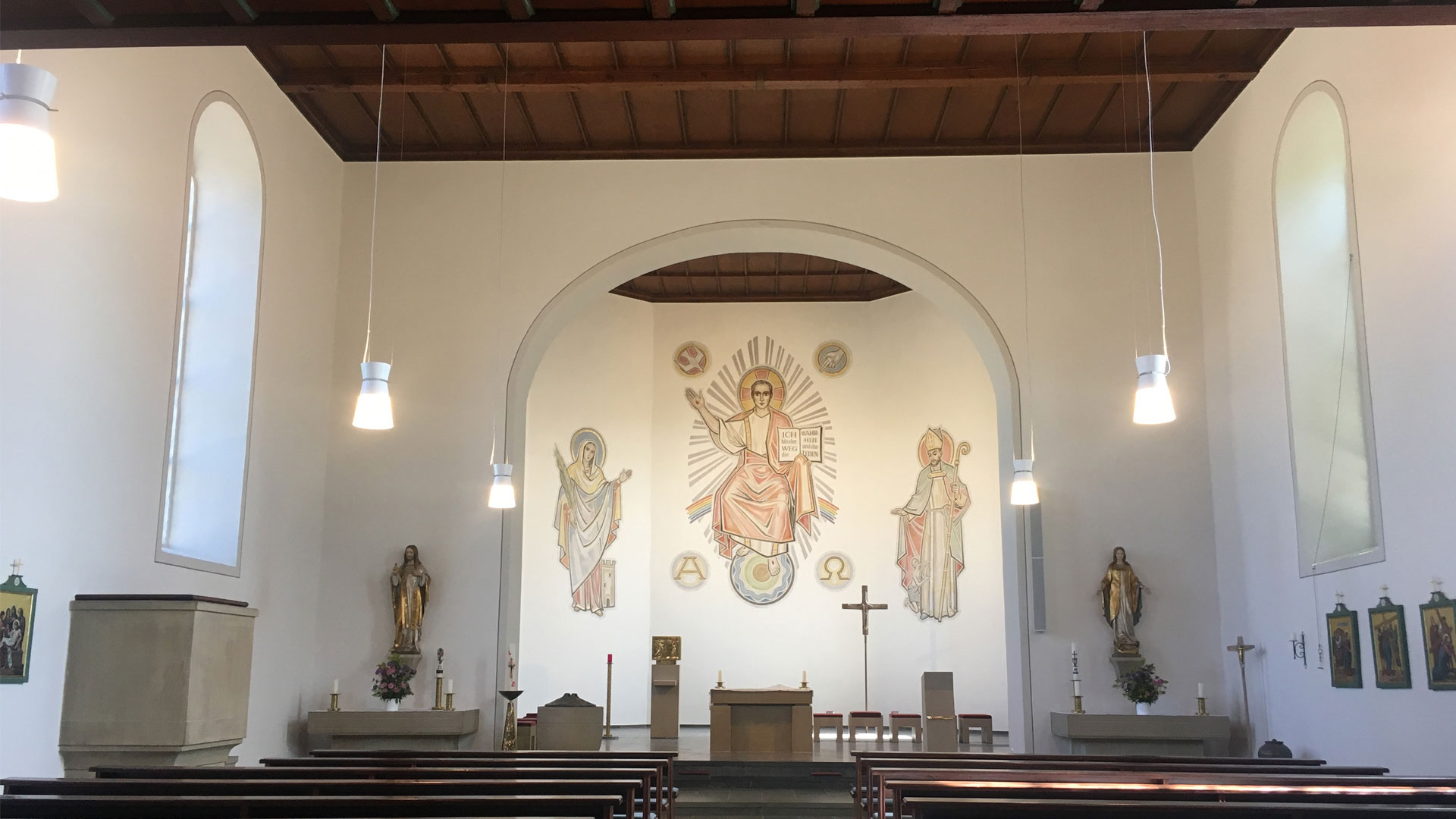 Die Leuchten im Kirchenschiff bieten der Gemeinde nun eine ausreichende Gleichmäßigkeit und Helligkeit. Der indirekte Lichtanteil kann separat dazu geregelt werden, wodurch die Holzdecke zu strahlen beginnt, der Raum mehr Volumen bekommt und behaglicher wirkt. Die Leuchten wirken nicht aufdringlich, eher zurückhaltend, was den Fokus auf die Schönheit der Kirche mit ihren Wandgemälden lenkt. Die Lichtfarbe wurde mit 2700K gewählt, um eine wunderbare Wärme in den Raum zu bekommen. Wandgemälde, Altar, Ambo und Seitenaltäre wurden mit neuen LED-Strahlern in das richtige Licht gesetzt, dabei wurden auch verschiedene Ausstrahlungswinkel gewählt. Die Schuten vor den Strahlern dienen der Entblendung. Alle Leuchten sind einzeln über die DALI-Lichtsteuerung Livelink von Trilux/Steinel regelbar.